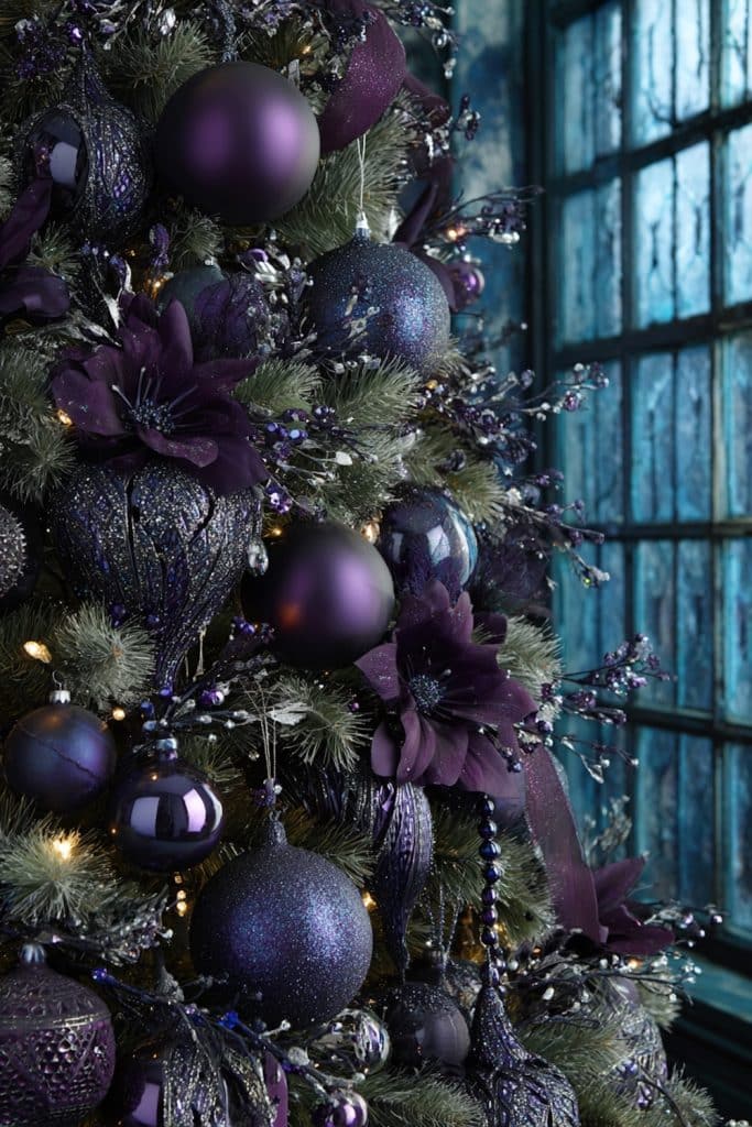 - Choose deep plum, burgundy-purple, and midnight-blue ornaments.