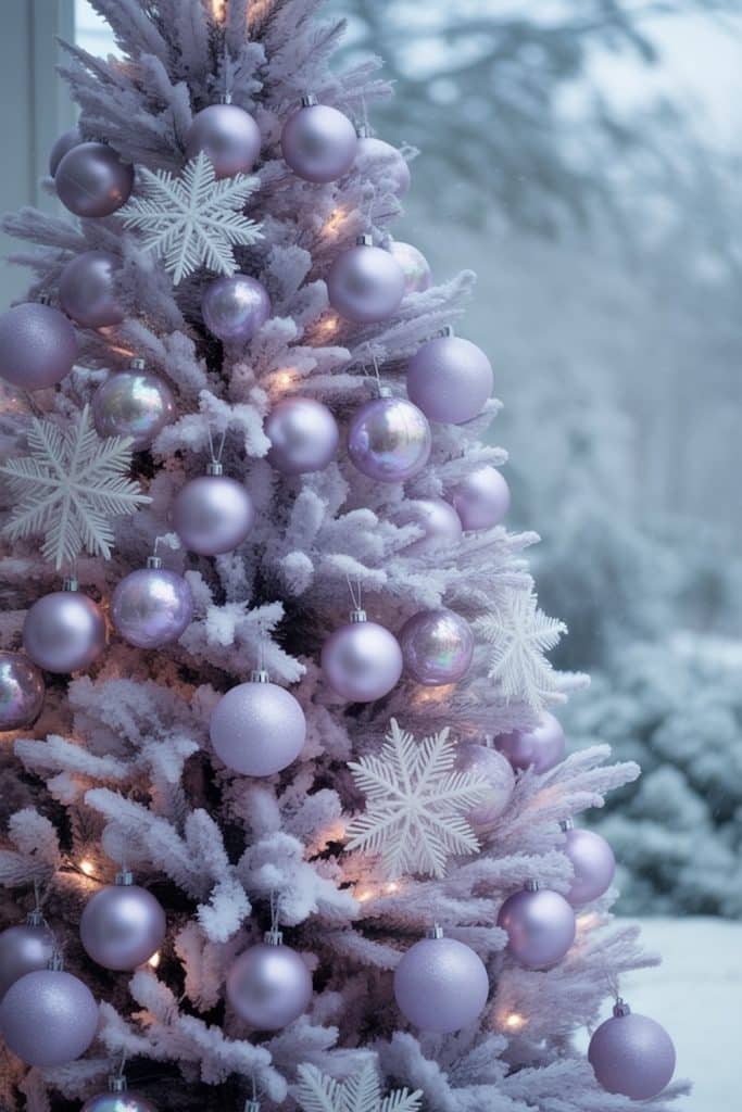 Soft. Dreamy. Romantic. This is the tree for people who want something whimsical and calm — not loud. Lavender ornaments mixed with frosted whites, snowflake garlands, and silver accents that catch the light like freshly fallen snow.