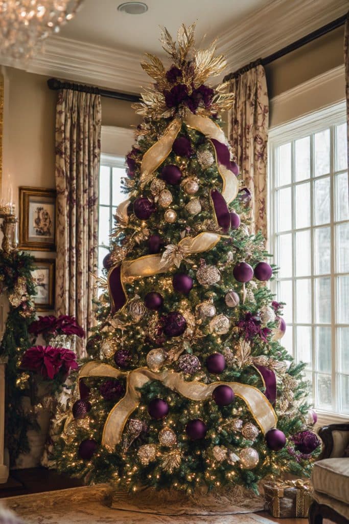 If you want drama – the glamorous kind – this is your tree. Deep amethyst ornaments glow against twinkling warm lights, wide gold ribbons, purple poinsettias, gold, pink, and white baubles. The sprays of golden branches makes everything pop.