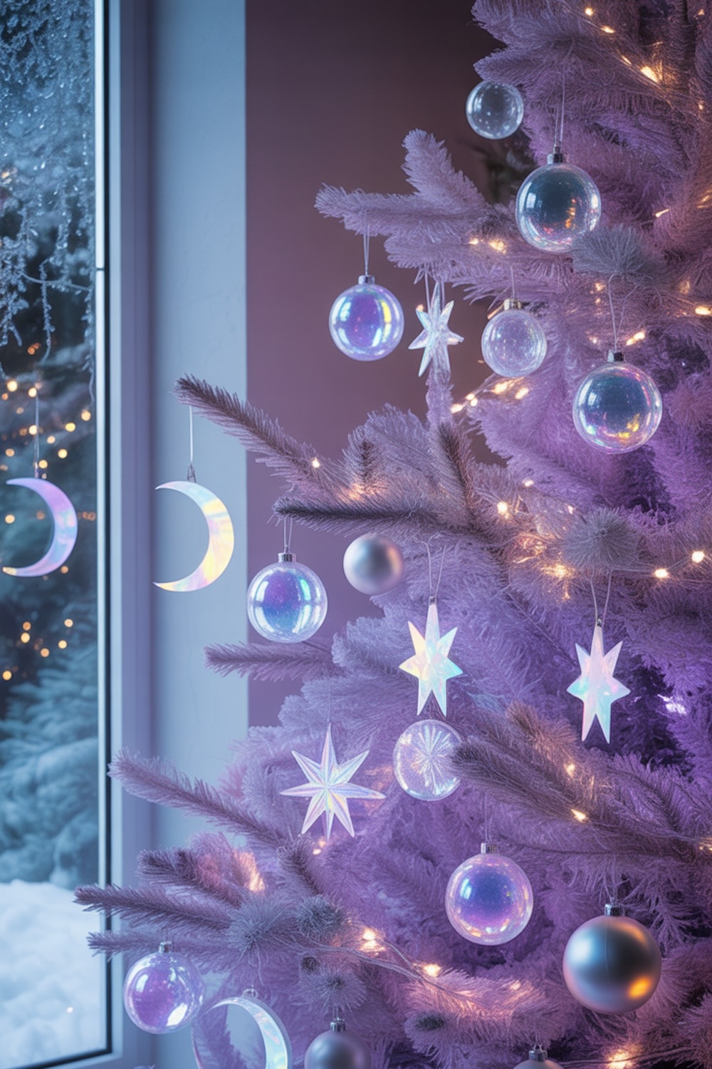 • Add iridescent ornaments for a magical, color-shifting effect.