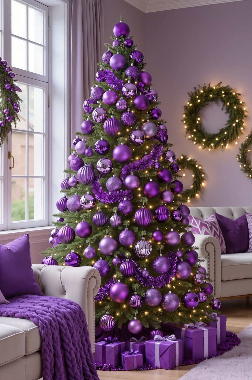 If you want drama — the glamorous kind — this is your tree. Imagine: Deep amethyst ornaments glowing against twinkling warm lights, metallic purple ribbons cascading down the branches, and a few emerald-green ornaments just to make everything pop.